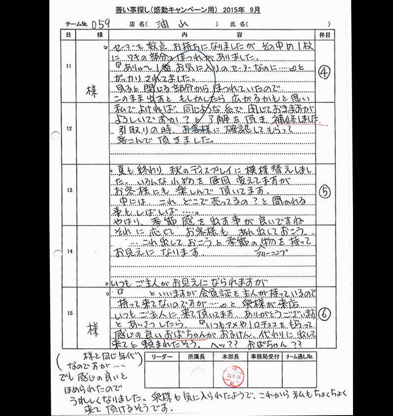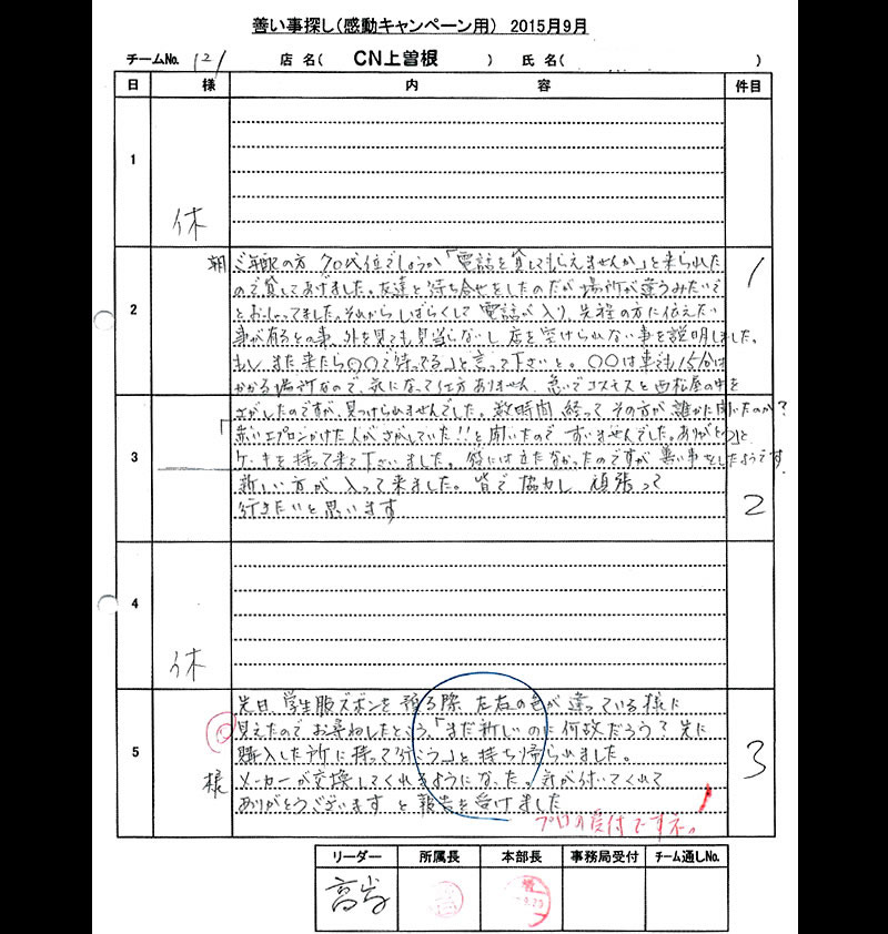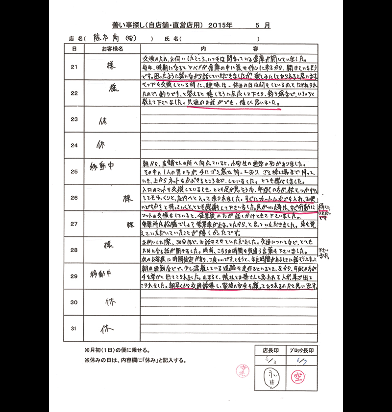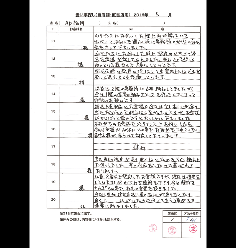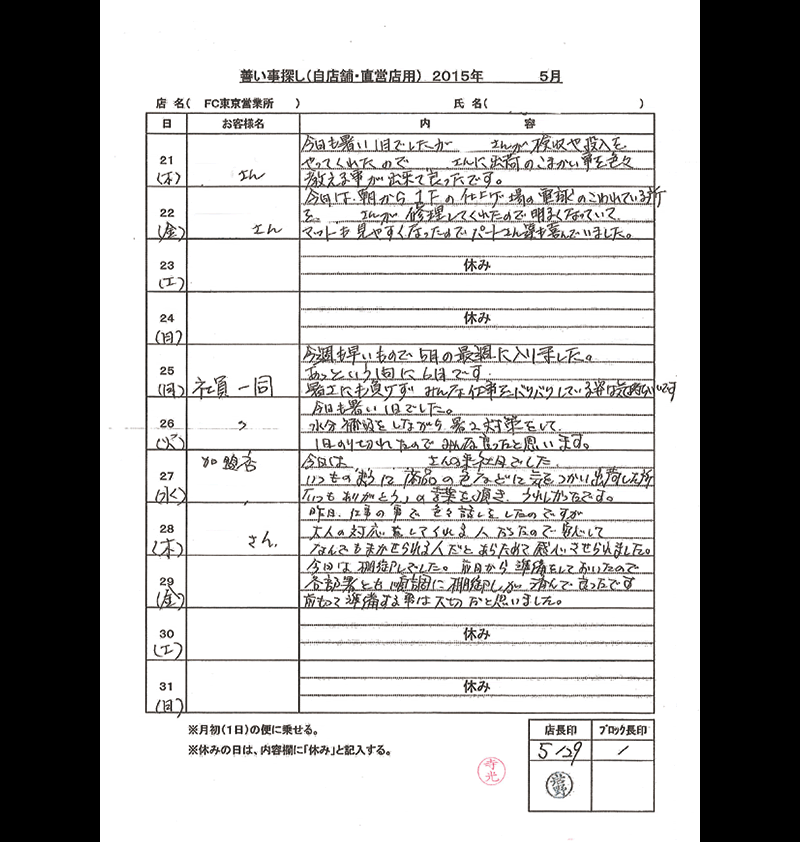 - 会社をあげて毎日続けている取り組みが、「善い事探し」です。これは、毎日誰かの善い事を見つけて報告するというもの。1 日を思い返して報告書を書く時間は、色んな方のおかげで仕事ができていることに感謝し、気持ちも和むひとときです。「善い事」の内容が業績給に反映されたり、表彰されることもあり、みんなのモチベーションにつながっています。